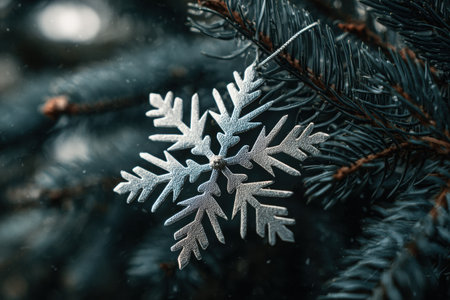 A close-up photograph showcases a snowflake ornament suspended from a pine tree branch. The image reveals intricate details of the ornament against a dark, blurred backdrop. The composition highlights the textures and shapes of the decoration. This image could be used for various commercial or editorial purposes.