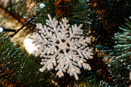 Silver snowflake ornament is beautifully displayed on a vibrant green Christmas tree branch, enhancing the festive atmosphere and showingcasing holiday spirit