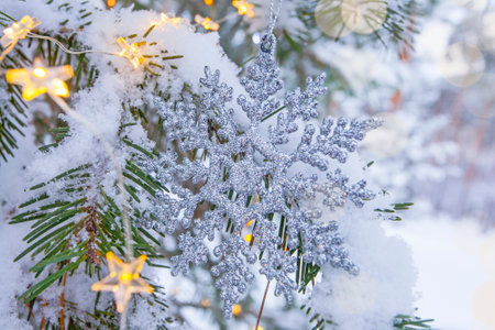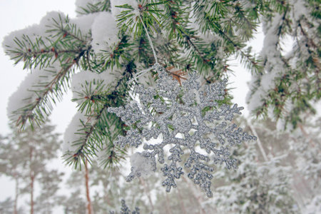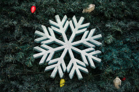 snowflake new year decoration hanging on the fir tree