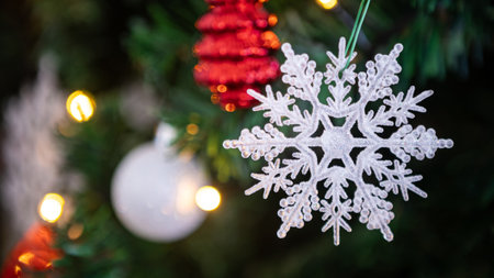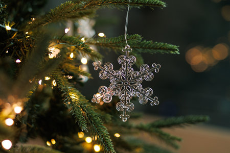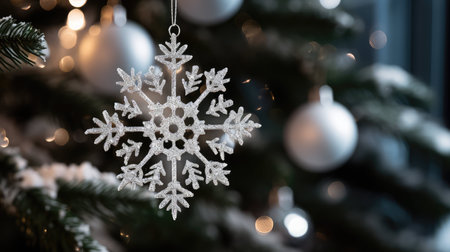 Christmas snowflake ornament hanging on a decorated Christmas tree branch. Warm string lights and a blurred background create a cozy festive atmosphere of winter holidays, Christmas, and New Year celebrations.