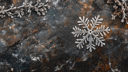 A close-up view of a delicate frost-covered snowflake on a dark stone surface, capturing the essence of winter's beauty and the intricate details of nature.