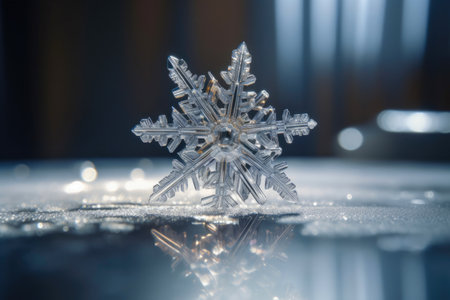A snowflake is suspended in the air above a dark background. The snowflake is surrounded by a blurry background, which gives the image a dreamy, ethereal quality