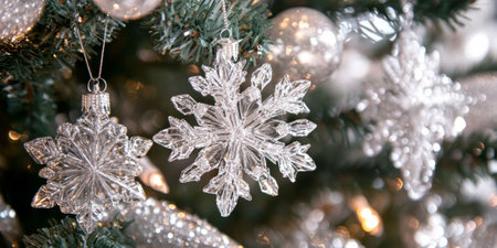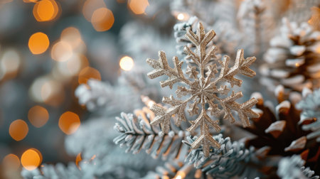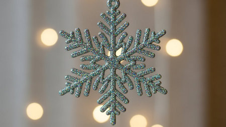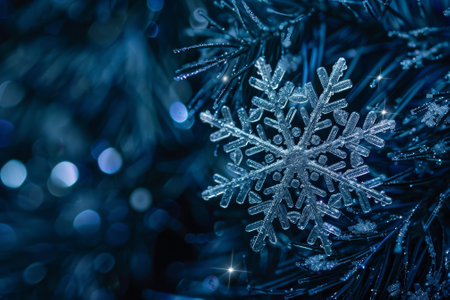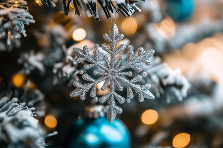 Close-up of sparkling snowflake ornament in silver and blue tones hanging on a pine branch with festive holiday lights glowing softly in the background