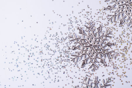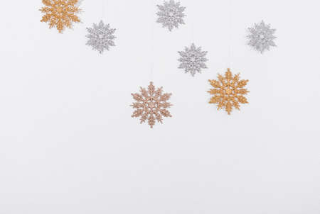 Christmas and New year snowy background. Snowflakes white silver and gold color flat lay. Winter season holidays snowfall,