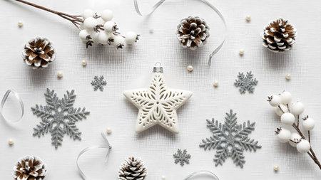 Christmas and New Year composition. White wooden snowflakes, pine cones, ribbons on white background. Flat lay, top view, copy space