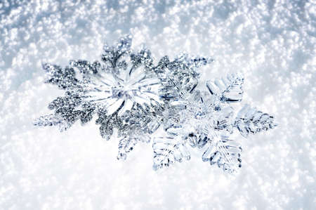 Beautiful silver snowflakes sparkle gently on fresh, glistening snow in winter.