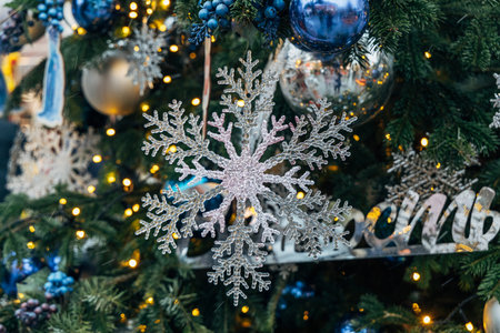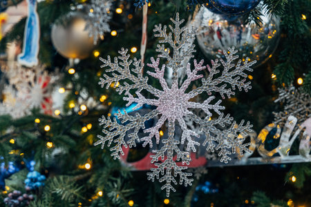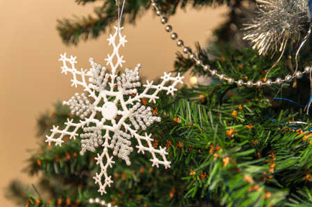 Beautiful festive snowflake decoration on the Christmas tree. Close up. Beautiful Christmas background. The concept of decorations and decorations for the new year