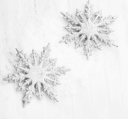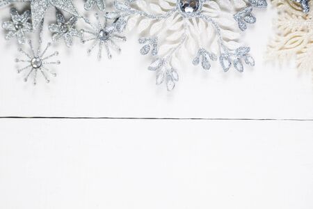 Silvery snowflakes on a white wooden background. Christmas decor.
