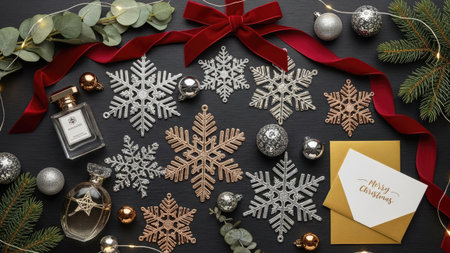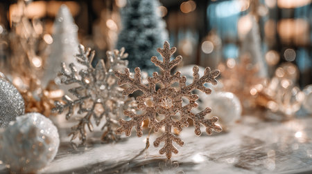 A stunning arrangement of sparkling snowflakes and festive decorations creates a warm atmosphere for Christmas celebrations in a cozy indoor setting.