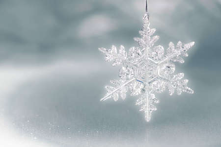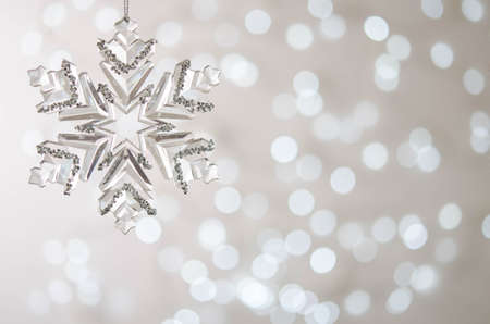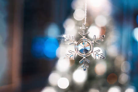 Transparent toy snowflake. Bokeh. Silver Christmas lights. Christmas decoration