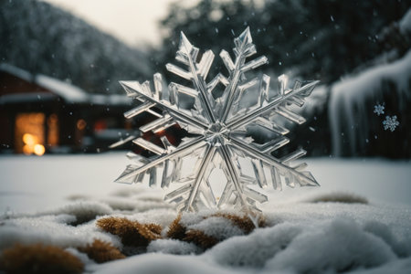 Snowflake on the snow in front of a wooden house in winter
