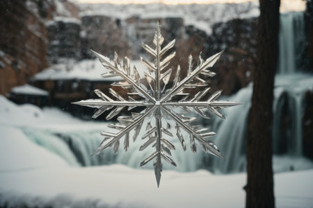 Snowflake on the background of a waterfall in the forest at sunset