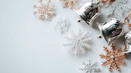 A charming arrangement of silver bells and snowflakes on a light background, ideal for winter-themed decorations, festive greetings, and joyful holiday moments.