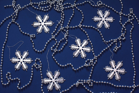 New year pattern of silver snowflakes and beads on the christmas tree, on a dark blue background. Top view, flat lay