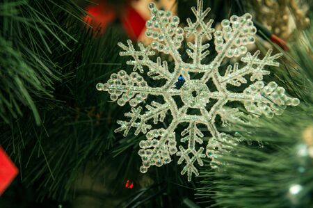 Close up, macro. Christmas decorations on a Christmas tree in the shape of a snowflake. Copy space.
