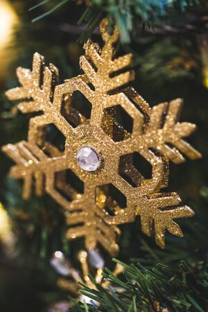 Gold flashing snowflake with diamond close-up as Christmas tree decor