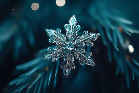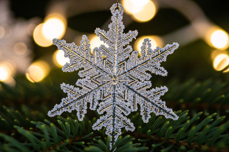 Intricate crystal snowflake ornament on pine branches
