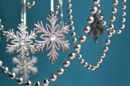 Christmas ornaments with silver and blue snowflake, beads