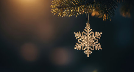 A golden snowflake ornament hangs gracefully from a pine branch, bathed in warm, inviting light against a dark, blurred background, evoking a festive Christmas mood.