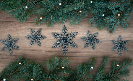 Christmas branches decorations on a wooden texture. Holiday Christmas background.