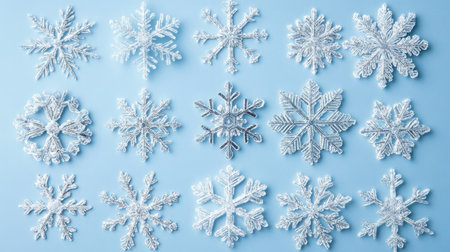 A collection of beautifully crafted snowflakes displayed on a soft blue background, showcasing intricate designs that evoke the beauty of winter. Perfect for seasonal themes.