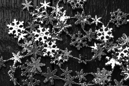 Silver snowflakes on a black background. Macro photo with shallow depth of field