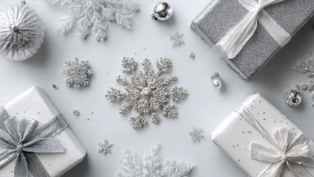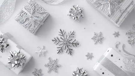 Christmas background. White gift boxes, silver snowflakes on white wooden background. Flat lay, top view, copy space