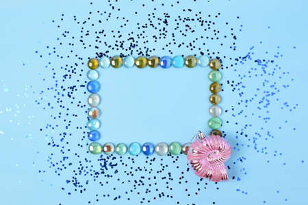 frame of multi-colored glass pebbles on blue background.Blue sparkles are scattered around the background. A Christmas pink toy in the shape of shell lies nearby.The concept of the sea and the holiday.