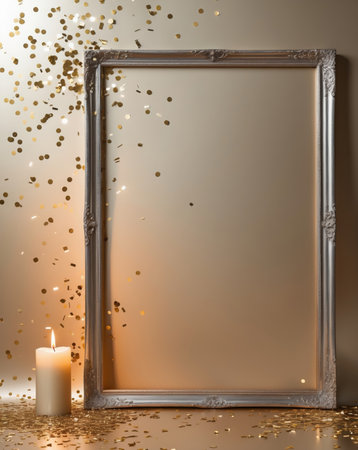 Silver picture frame with falling confetti and burning candle. 3d rendering