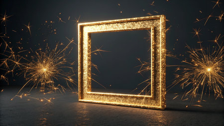 Golden frame with sparklers on a dark background. 3D rendering