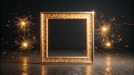 Gold frame with sparklers on a concrete floor. 3D rendering