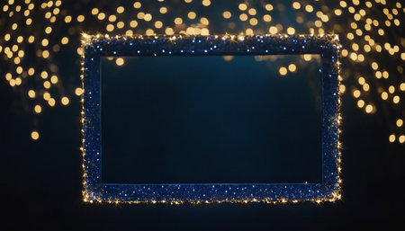 Photo frame with bokeh lights on black background, copy space