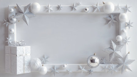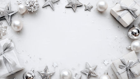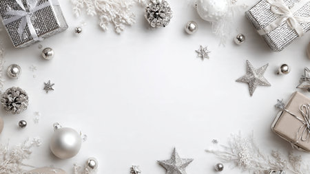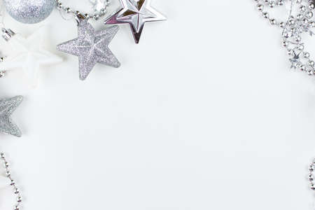 Christmas background with silver and white decorations on white. Top view with copy space.