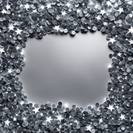 Silver confetti on a dark background with a place for your text