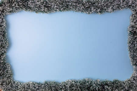 A silvery tinsel with pine cones in the corners frames the blank light background. New Year card. Top view