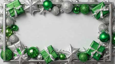 Natural holiday frame with green pine effects and silver reflective ornaments.