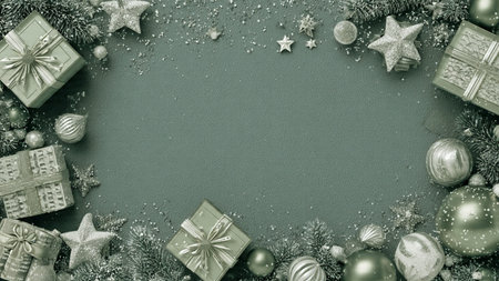 Elegant flat lay featuring warm green shadows, silver baubles, and modern holiday ribbons.