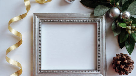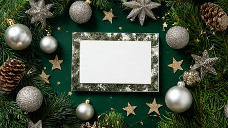 Luxurious Christmas greenery paired with metallic ornaments forming a stunning frame.