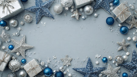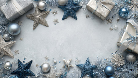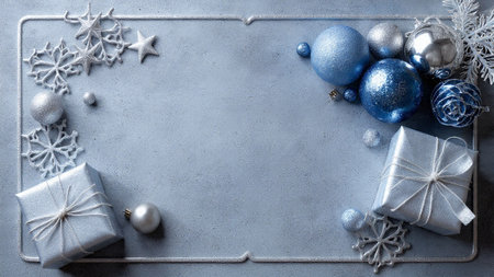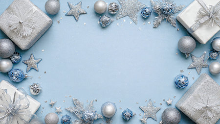 Silver Christmas decorations on pastel blue gray background. Flat lay style. Holiday classic concept.
