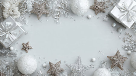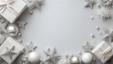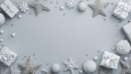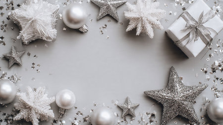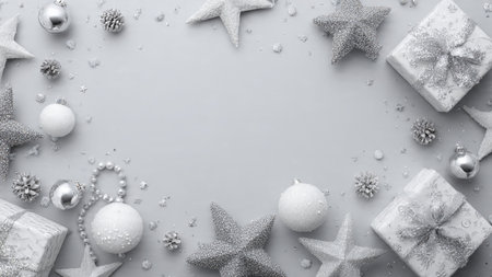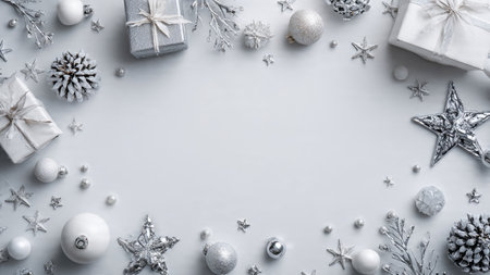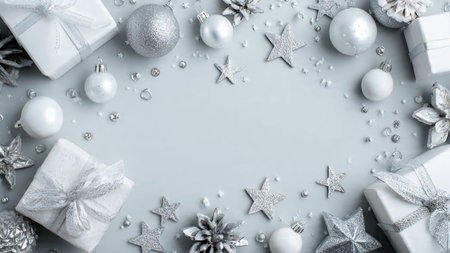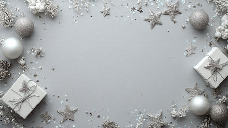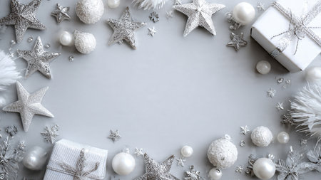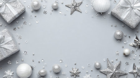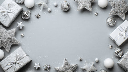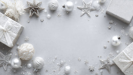 Christmas background with silver and white decorations on gray. Top view with copy space.