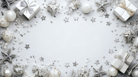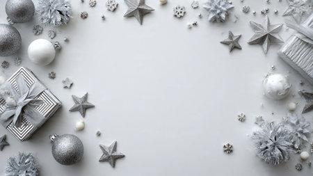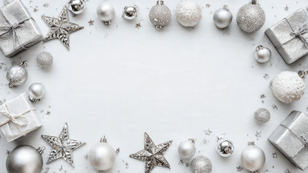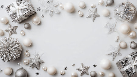 Christmas background with silver and white decorations. Top view with copy space.