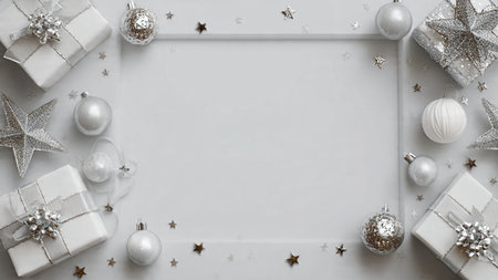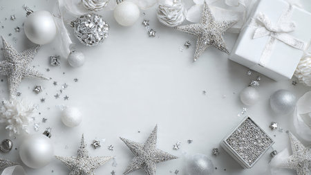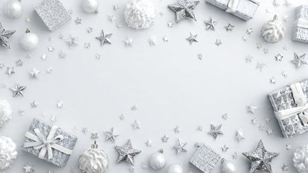 Christmas background with silver and white decorations. Top view with copy space