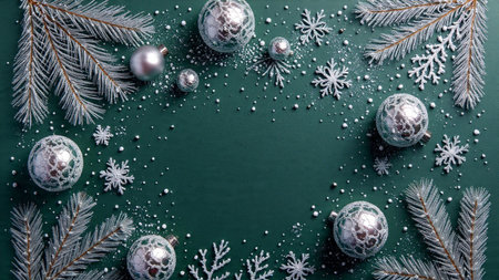A dazzling Christmas frame with glossy silver decorations sitting beside dark green baubles.