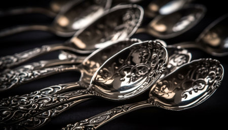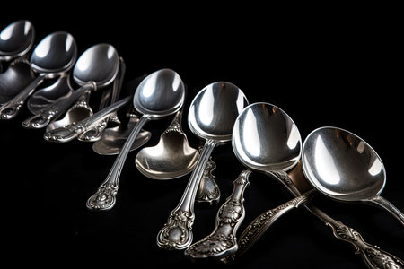 antique silver spoons arranged in row on black background, created with generative ai