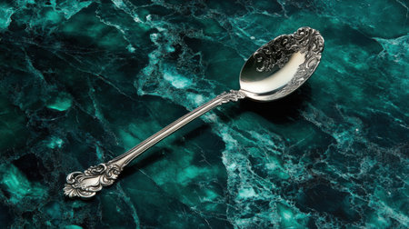 A beautifully crafted silver spoon lies elegantly on a rich dark green marble surface, highlighting intricate designs and luxurious features in a detailed composition.