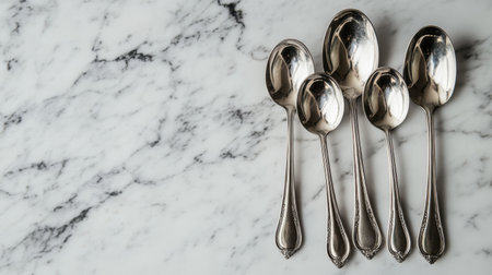 A captivating arrangement of vintage silver spoons rests elegantly on a polished marble surface, ideal for inspiring culinary presentations and sophisticated dining setups.