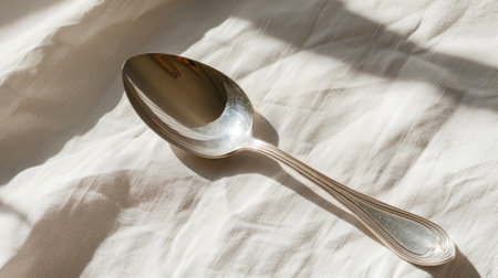 Shiny silver spoon on wrinkled white cloth under sunlight