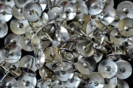 Thumb tacks (drawing pins) on a dark background close up. Background