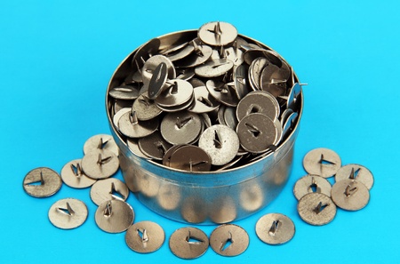 Metal button for attaching the ad to the board. A stationery item on a blue table with a reflection