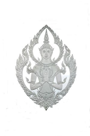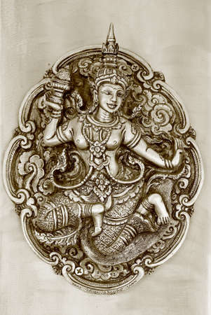 Silver carving female angel fly on clouds sky on wall with buddha image at the temple in Thailand.